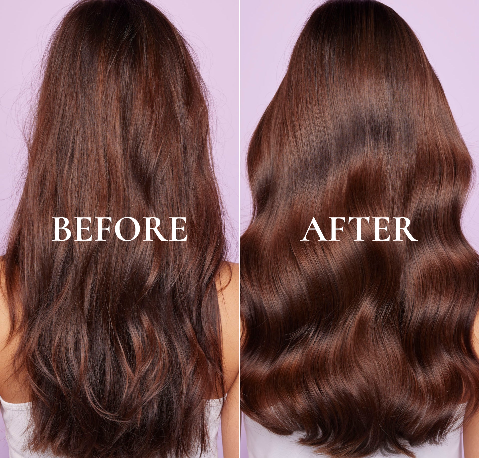 Antes-después: Resultados tras la aplicación del Champú Brillo Sublime, la Mascarilla Capilar Reparación Intensiva y la Leche Desenredante Sin Aclarado.