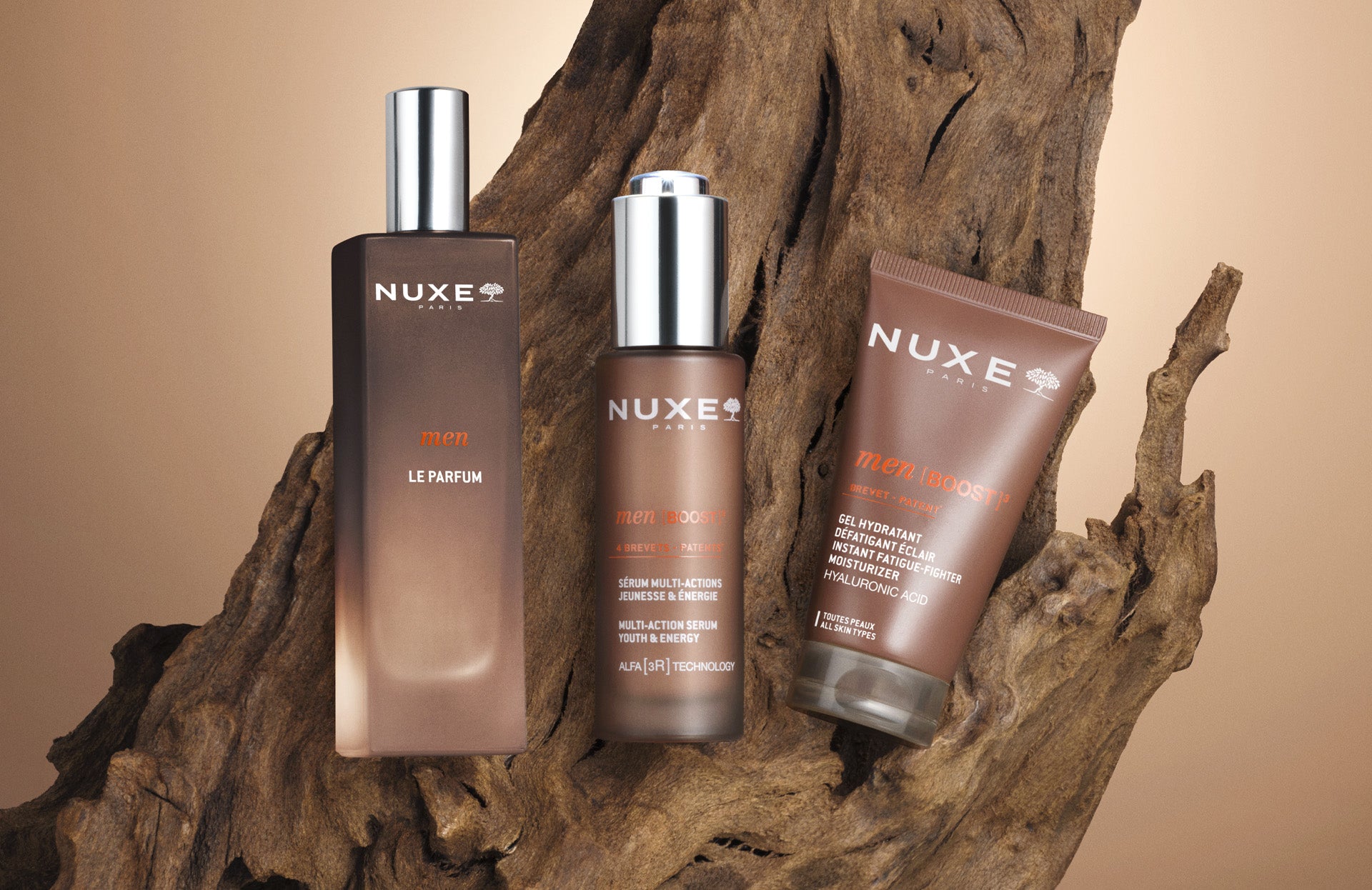 La gama MEN [BOOST]³ se dirige a los hombres modernos y exigentes que se preocupan por su bienestar. Propone tratamientos completos para el rostro, el cuerpo y el afeitado, además de presentar la primera Eau de Parfum NUXE para hombre. Una rutina sencilla, eficaz y agradable para los hombres a los que les gusta cuidarse cada día, sin concesiones.