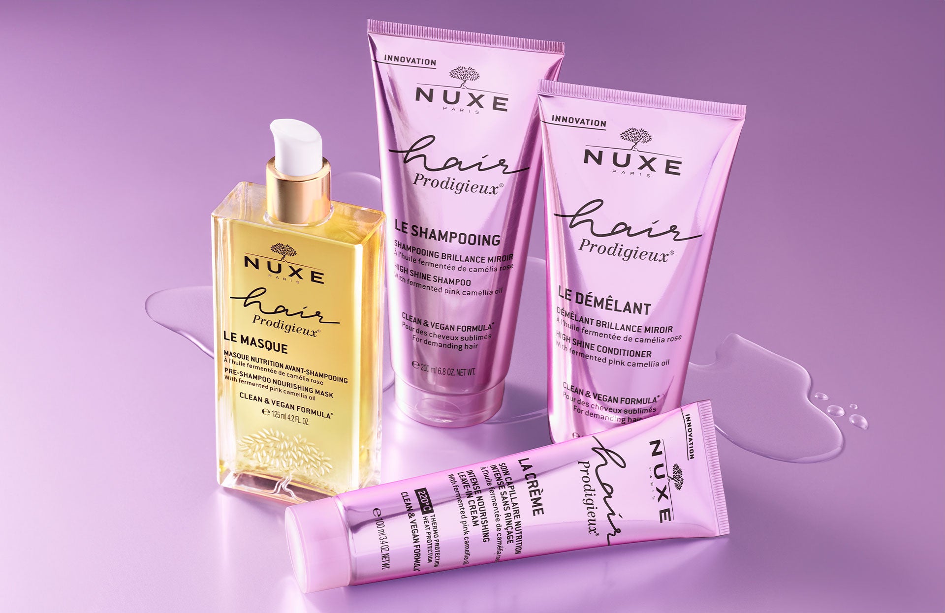 NUXE lanzó su primera colección de tratamientos capilares, que ofrece una importante innovación en su formulación: aceite fermentado de camelia rosa. Es el resultado de un proceso de fermentación exclusivo que potencia sus poderes para reparar y nutrir el cabello. Estos tratamientos veganos⁽²⁾, sin silicona ni sulfatos (₁₁), se formulan respetando el cabello y envolviéndolo con su firma sensorial única. NUXE, fiel a su carácter audaz, propone también un tratamiento innovador ultraeficaz para reparar el cabello, la Mascarilla Nutrición Pre-Champú.