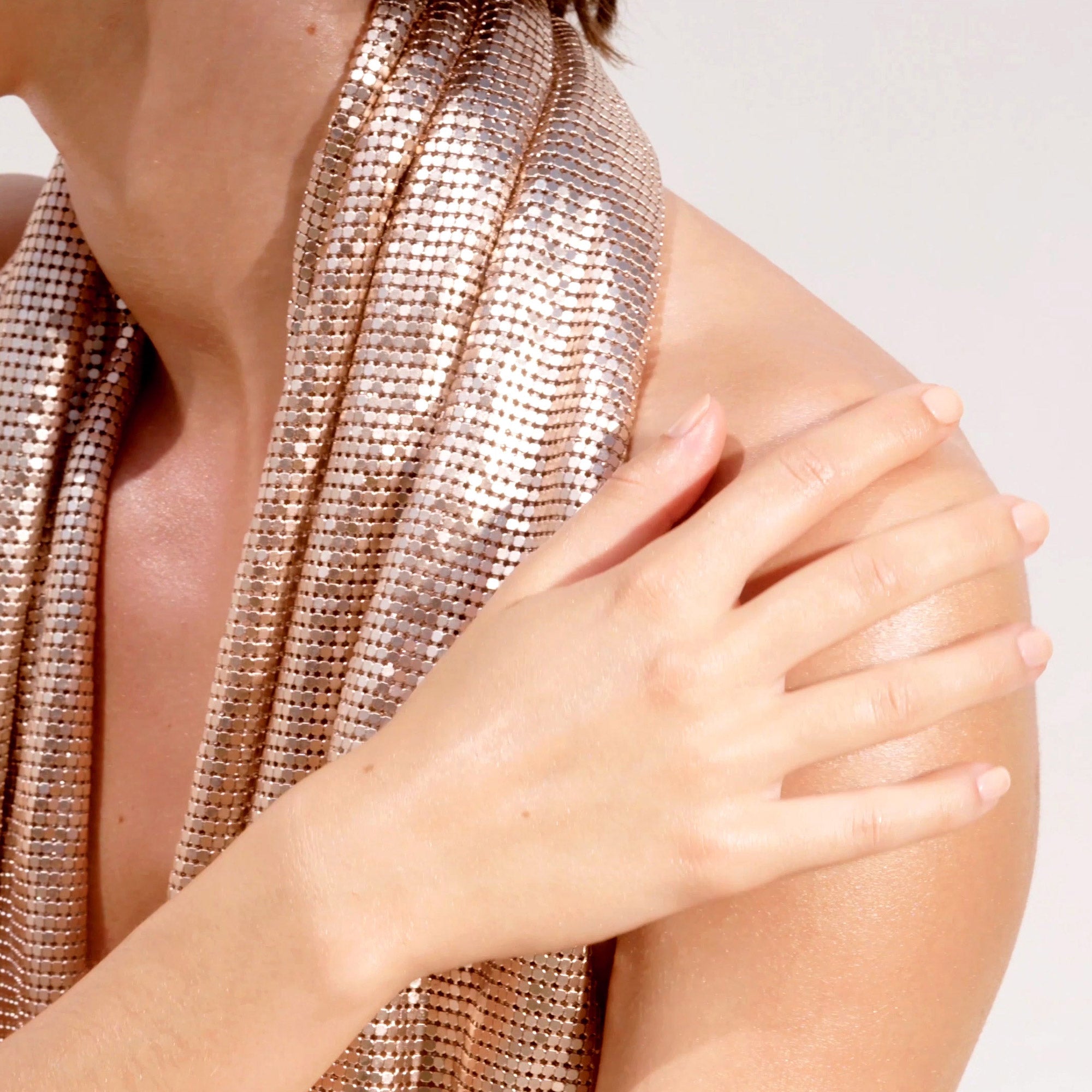 Este aceite seco con reflejos de nácares de origen natural procura un irresistible brillo oro rosado iridiscente a todos los tipos de piel. Hidrata, satina e ilumina en un solo gesto rostro, cuerpo y cabello. La piel está sublimada, suave y sedosa, sin acabado graso.