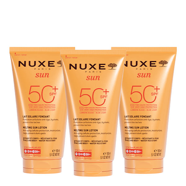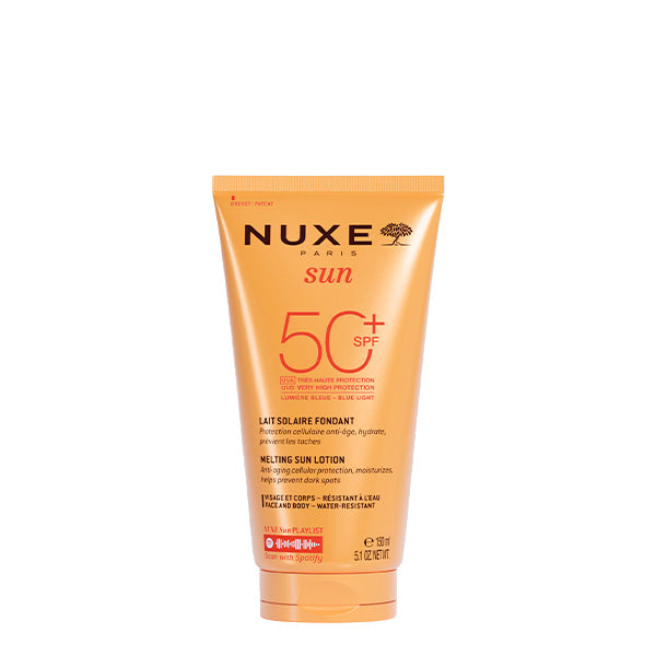 Esta Leche Solar SPF50+ rostro y cuerpo garantiza una protección de amplio espectro frente a los UVA/UVB y a la luz azul gracias a un exclusivo sistema de filtros patentado⁽¹⁾. Ofrece una protección celular antiedad reforzada⁽²⁾ e hidrata al instante, al tiempo que previene la aparición de manchas. Resistente al agua y no comedogénica, es adecuada para todos los tipos de piel.