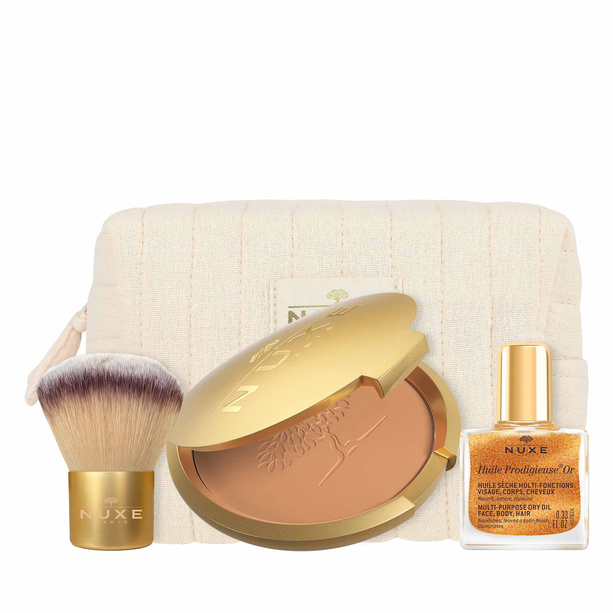 Un dúo iluminador para realzar el rostro y sublimar la piel, con su brocha kabuki en un elegante estuche.